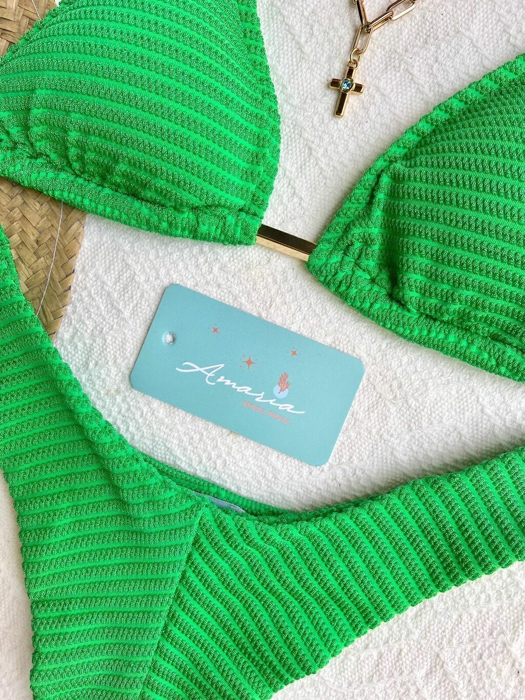 Modelo cortininha com amarração no pescoço e costas. A calcinha é no modelo asa delta semi fio, com forro duplo no bumbum e forro com proteção UV nas demais areas. Os metais são banhados a ouro.