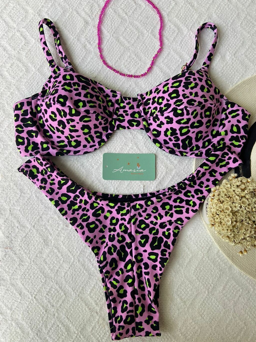 Biquíni sutiã meia taça estampa oncinha rosa claro TAMANHO G